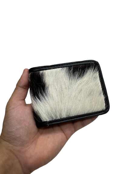 A wallet that captures the untamed beauty of nature, the Prestige Cowhide Wallet is handcrafted from genuine cowhide with natural hair-on finish. Its striking black-and-white pattern offers a bold contrast, ensuring every piece is truly unique. Encased in fine black leather trim, this wallet blends raw authenticity with timeless luxury — a refined companion for those who value individuality and artisanal craftsmanship.