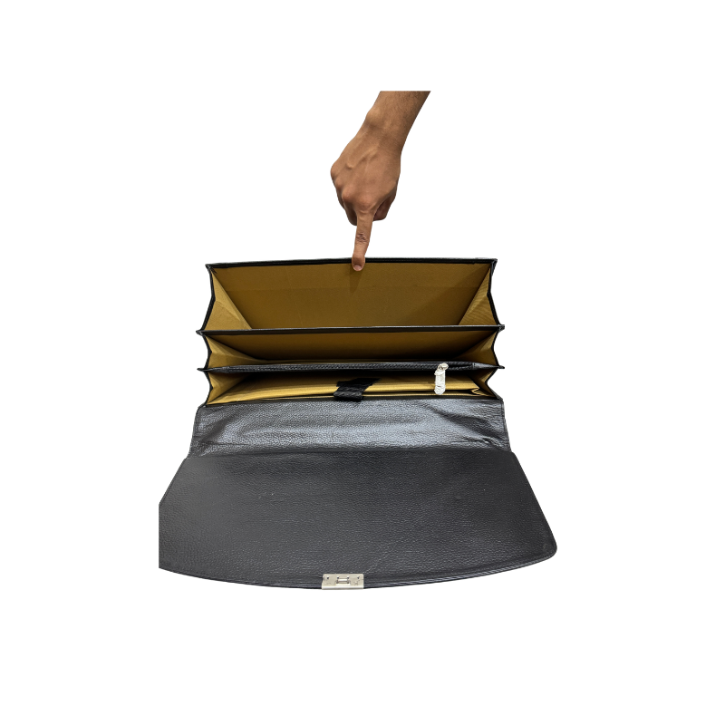 Command the boardroom with The Regent Brief by Dashim Crafts — a statement of authority, elegance, and enduring craftsmanship. Meticulously handcrafted from 100% original leather, its deep black finish exudes quiet sophistication, while the structured silhouette and polished metal lock closure add a refined, contemporary edge.